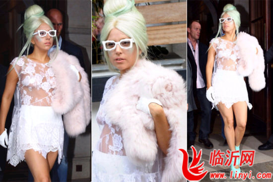 Lady Gaga透视蕾丝裙搭配淡粉色皮草披肩