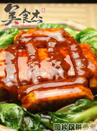 5、用中火烧热炒锅,倒入蒸肉的原汁,加淡二汤和酱油(5克),用湿淀粉调稀匀芡,加油(15克)推匀、淋在扣肉上便成
