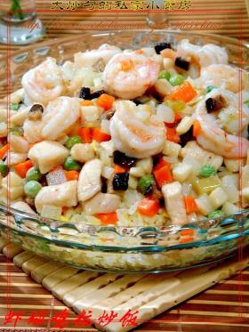 16.把炒好的配料倒在炒饭上便可上桌享用。
