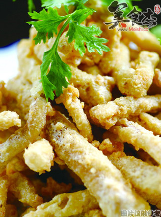 2、坐锅点火倒入油,待油热后放入拌好的茶树菇炸至金黄色捞出控油,锅中留少许底油,放入咸蛋黄加盐、白糖炒散,倒入炸好的茶树菇炒匀出锅即可。