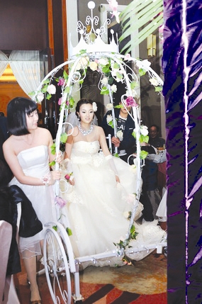 新娘出场方式往往是婚礼中的重头戏。吊纲丝太危险且价格昂贵,由爸爸陪着太传统,一个人出场未免太形单影只。眼下,经济、时尚又环保的出场方式,就是坐南瓜车。每一个女孩都有一个梦想,希望自己就是穿上水晶鞋、坐上南瓜车、跟着王子奔向皇宫的那个灰姑娘。因此,坐南瓜车成为新娘推崇的出场方式。但该出场方式对场地有一定要求,必须大厅宽敞且有足够宽的“通道”才适合。