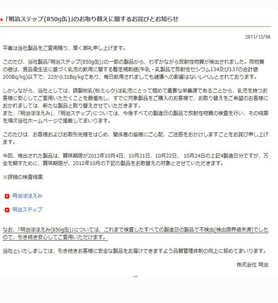明治称,检测出铯的是保质期为2012年10月3日、4日、5日、6日、21日、22日、23日、24日的奶粉。保质期显示在奶粉罐底部。这些奶粉均为埼玉县春日部市的明治工厂生产。公司称,可能是在对原料进行干燥处理时混入了大气中的铯。据悉,用于制成原料奶粉的牛奶是在福岛核电站事故发生前生产的。