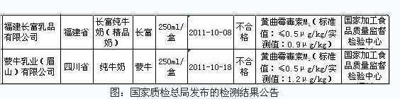 这两种产品分别是福建长富乳品有限公司的长富纯牛奶(精品奶),黄曲霉毒素M1(标准值:≤0.5μg/kg/实测值:0.9μg/kg);