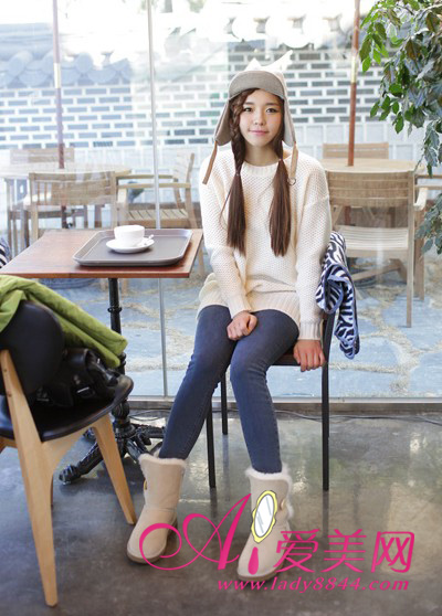 干净的素色毛衣绝对是秋冬必备款,搭配上同色系的帽子和雪地靴,简约风却不失青春甜美。