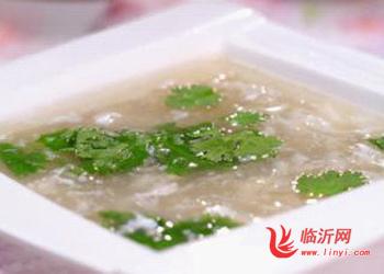 4、生粉加水做芡汁,倒入锅里,加盐、白胡椒粉、汤汁浓稠后,倒入蛋清,轻轻用筷子搅一下,鸡蛋液变飞絮,最后撒入香菜沫即可出锅。