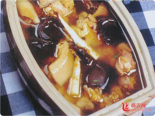1、鸡斩成块,焯水,放入沙锅中,加高汤、绍酒、姜、葱炖2.5小时;