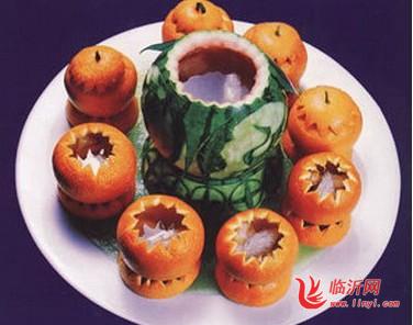 8. 挖去瓜瓤,在瓜皮上雕成图案或文字,放入沸水中烫约2分钟,至瓜皮变色(瓜内不能渗入沸水)放在大碗内;
