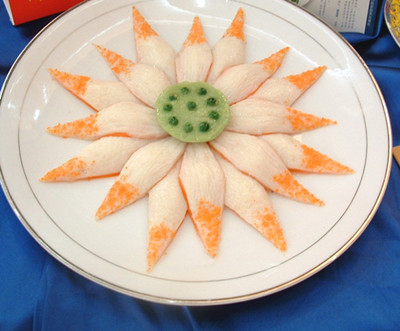 2.豆腐3片,剔去表面的皮,再片成4毫米厚,改成荷花瓣形,摊入盘内,撒上少许盐。将余下的豆腐剔去皮捣烂过罗筛,加入鸡蛋2个去黄用清,胡椒粉和适量的盐、少许白糖、味精、湿淀粉搅拌均匀。