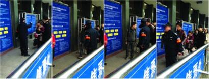 13日,一名身穿制服、佩戴“客票调查”字样的人将两名无票旅客带入南站,进站口工作人员未予阻拦。新华社发