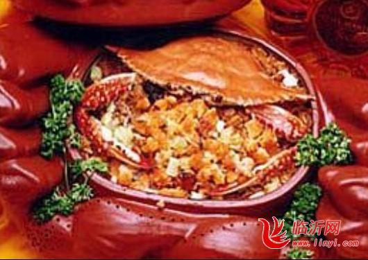 ③将拌好的糯米饭放入1只大蒸碗中,再将切块之蟹按原形排列在糯米饭上,并将葱、姜散放在蟹块上,上锅用大火蒸熟(约40分钟)。