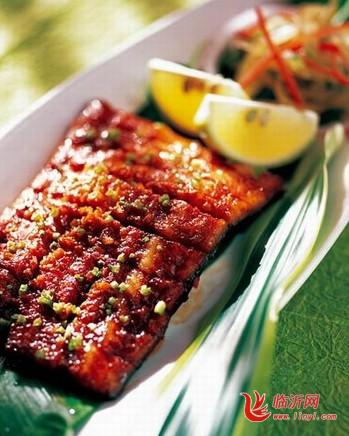 3.将腌渍过的鳗入烤箱(温度70℃)烤5分钟取出,抹上骨汁翻面再烤5分钟,再抹骨汁再翻面烤,如是反复三次,待鳗鱼烤熟,取出切段装盘,点缀上香菜、萝卜酸即成。外酥里嫩,原汁原味