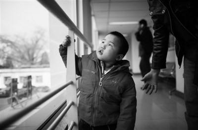 2010年11月,益益在京治疗。因为双目接近失明,益益抓到任何东西,都喜欢用嘴去咬,感觉这个东西。资料图片 本报记者 韩萌 摄
