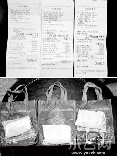 上图为银行刷卡回执单。下图为药材(左,中:冬虫夏草各200g,右:藏红花和另一种药材)。(微博截图)
