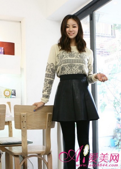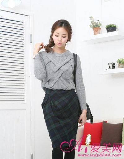 灰色扭花织法打底衫,搭配呢料格子包身裙,很显淑女味。