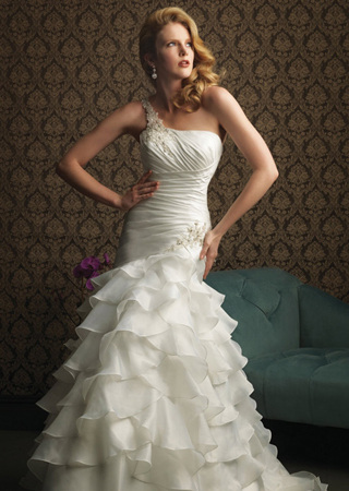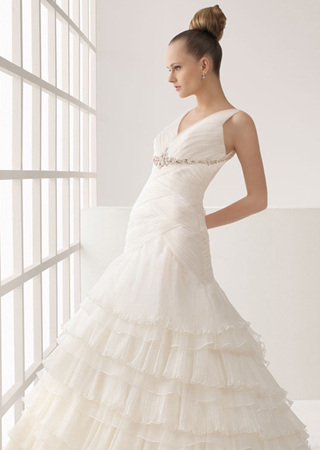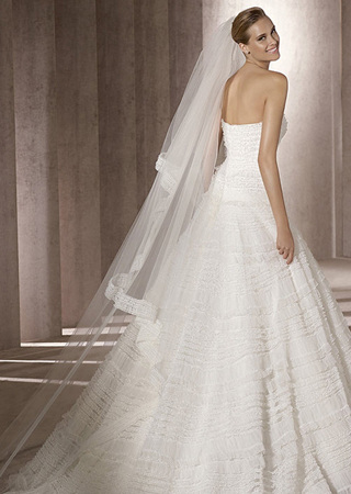 精致的蕾丝让丝缎的婚纱充满细腻的女人味;腰部独具匠心的层叠设计,通过纤细的腰部将胸线烘托得饱满;A型轮廓将体态娇小的新娘塑造得玲珑有致。