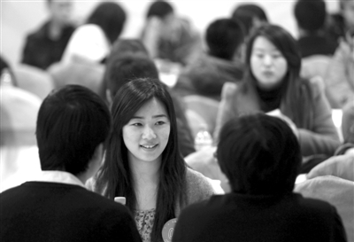 单身男女在互相交流。昨日,百名30岁左右的“剩男剩女”参加了由中国社会工作协会主办的相亲会。本报记者吴江摄