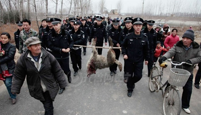 民警抬着被打死的大灰狼