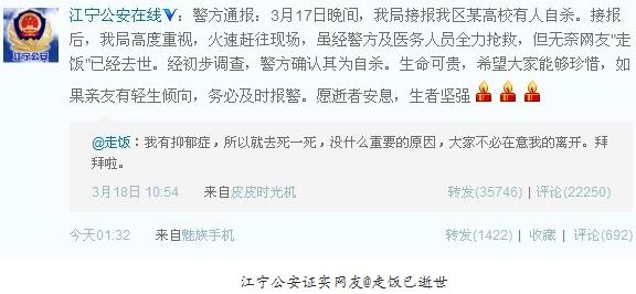 “我有抑郁症,所以就去死一死,没什么重要的原因,大家不必在意我的离开。拜拜啦。”3月18日上午10:54,一条透过时光机发布的新浪微博消息让众多网友为之一震。19日凌晨1:32,江宁公安在线(微博)发布微博证实,该女生已经遗憾去世。