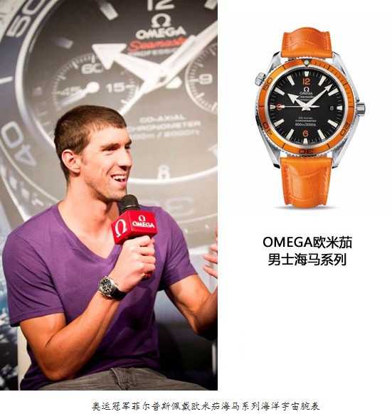菲尔普斯为欧米茄代言所佩戴的海洋宇宙是1957年海马系列300米潜水手表的改进款式,该系列采用了同轴擒纵机芯,性能超越了专业潜水表的一贯标准。这款腕表启用了纵轮计时装置,螺旋式底盖上的海马徽章、有齿边的表圈、顺滑的钢表带和对比强烈的颜色,均呈现出海马手表的经典特点。选用水中蛟龙菲尔普斯代言,以他无以撼动的水中霸主地位诠释了这款表的水下专业性和高端性。