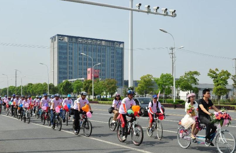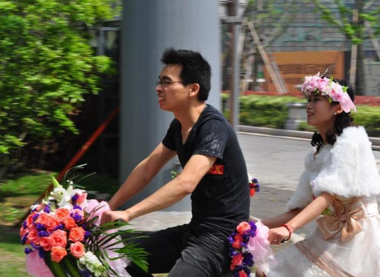 4月22日,新郎“球球”(前)骑双人同骑特制单车去迎娶新娘。 当日,一场环保时尚的单车婚礼在江苏吴江举行。新郎“球球”和新娘“一凡”因喜欢骑单车而相识相恋。大喜之日,这对新人选择了举办一场单车婚礼来纪念这个特殊的日子。两人同属的“任我行”单车俱乐部的100多名会员参加了婚礼。