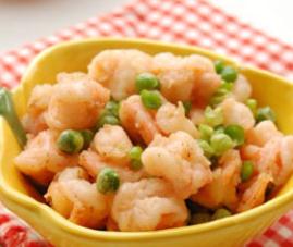 9.虾仁重新入锅,和豌豆同炒至味道融合即可,可加少许糖调味