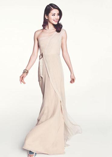 单肩式裸色轻纱曳地礼裙,柔和裸色向来是极致优雅古典的最佳诠释。裸色薄纱轻挂肩上一路垂顺及地,罗马风格与简约主义的完美结合,行走间轻盈飘逸。