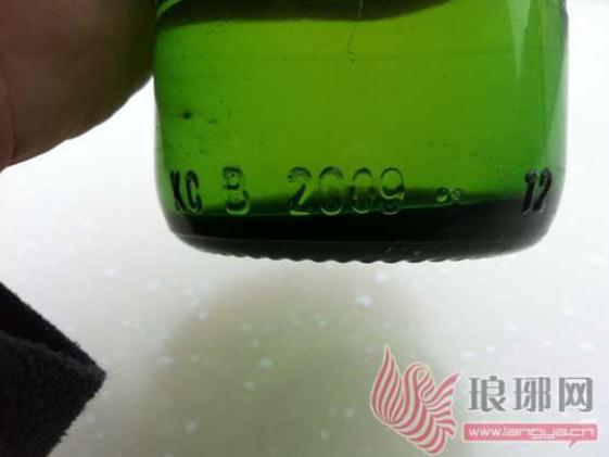 4月29日下午,在金雀山路与沂州路交会处附近一家快餐店里,记者见到了赵先生所说的啤酒瓶,只见酒瓶下面的内部,有些许黑色的斑点,酒瓶外侧底部印有“2009”的字样。