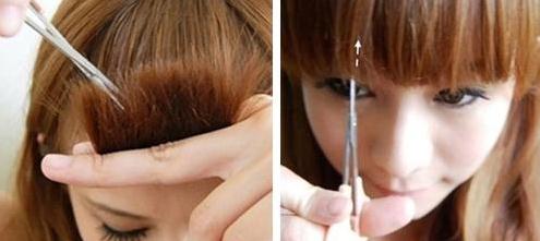 先把刘海梳平顺,然后用食指和中指夹着发梢,沿着直线慢慢的剪过来。切记一定要慢,剪刀要摆平。