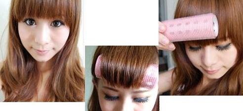 剪完之后长度适中,但发丝稍显凌乱,而且贴着额头也不好看。于是我们用大卷筒将刘海卷一会儿。卷完之后再用卷筒表面梳一下,立刻发丝就顺滑许多。