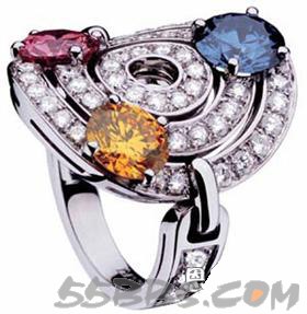 红黄蓝三色宝石的镶嵌设计将新娘的指间衬托的更加美丽动人,戒环的小颗粒钻石镶嵌设计将新娘的指间衬托的更加光彩照人,让新娘的指间焕发一种闪耀的迷人光彩。