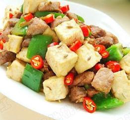 3、锅里放油,烧到四成热时放入葱花爆香,然后放入羊肉翻炒,炒到羊肉退去红色,放入孜然炒出香味,再放入豆腐丁和青椒丁翻炒一分钟,加入盐、生抽即可出锅。