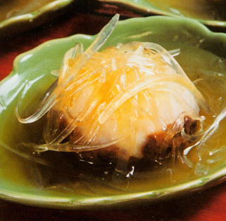 (4)鱼翅酿花菇入笼蒸3分钟,同时起锅放上汤500g,加精盐2g、味精1g、鸡粉1g,勾薄芡分浇再蒸熟的鱼翅酿花菇上即成。