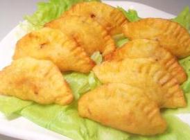3.取土豆泥包入牛肉馅料成饺子状,上笼蒸熟,再下油锅炸至金黄色时装盘。