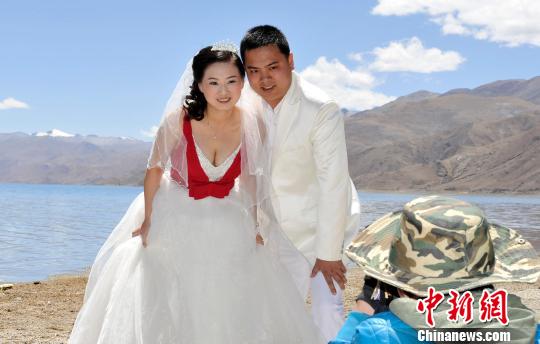 “圣地婚礼”的新人们在羊卓雍错拍摄婚纱照。李林摄