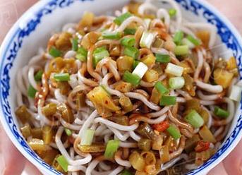 材料:鲜面条150g(最好是碱水面),榨菜,酸豆角,香葱。