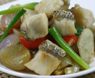 2、油热后,放红葱头,沙姜,姜片爆炒,放鱼块,翻炒,动作要轻,免得鱼块碎,轻轻晃动锅子,可使鱼块受热均匀,能漂亮地翻锅就更好了。鱼肉变色后加生抽,蚝油 翻炒,最后加葱段,红椒,加一点酒即可出锅。