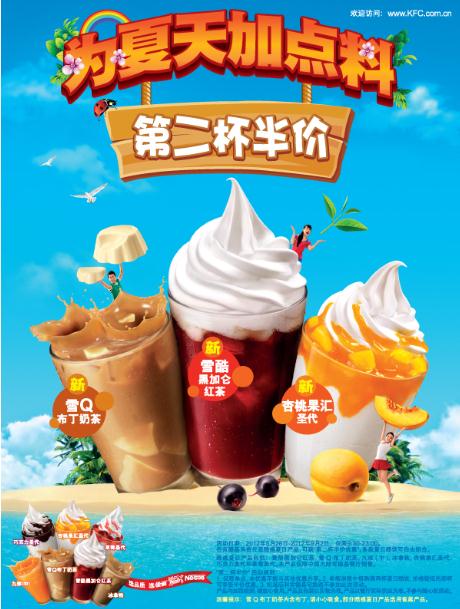 在肯德基消费任意夏日酷饮产品,可获“第二杯半价优惠”。多款夏日酷饮可自由组合。夏日酷饮产品包括:雪酷黑加仑红茶、雪Q布丁奶茶、九珍(中)、冰拿铁、杏桃果汇圣代、巧克力圣代和草莓圣代。本产品仅限中国大陆肯德基餐厅销售。