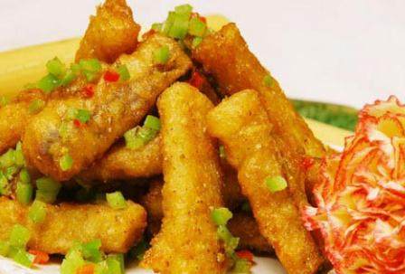 3. 锅置旺火上,下花生油烧六成热时,将腌渍过的鱼条逐个挂蛋面糊后下锅炸至金黄色时捞起,再用冷油淋一下,装盘;