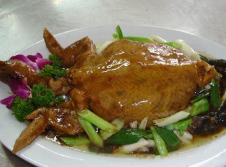 10. 蒸好的鸡取出,拣出鸡骨架、姜片、猪肉,用精盐、料酒调味即成。
