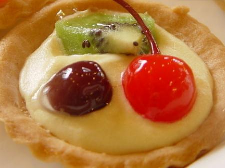 4)、 将布丁馅装入挤花袋中,分别挤适量于每片消化饼上,再依序排上草莓、猕猴桃及少许蓝莓粒即可。
