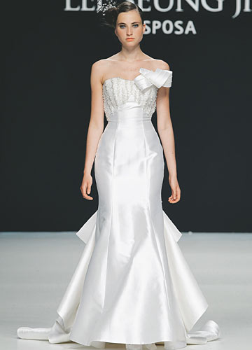 光洁硬挺的亮缎可以轻易塑造华丽廓形,又折射出细腻而温润的光泽,各种风格款型信手捏来,打造简洁大气的经典新娘形象。