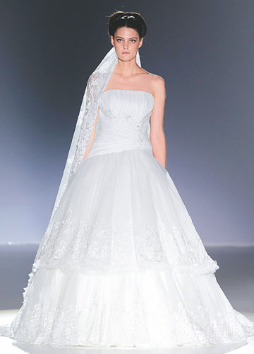 长款蕾丝头纱+裹胸公主蓬裙婚纱