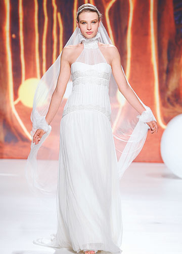 蓬松的短款头纱缀满振翅欲飞的纱质蝴蝶,为简单光洁的亮锻婚纱增添了活泼的动感。搭配卷曲长发,俏丽感立显。