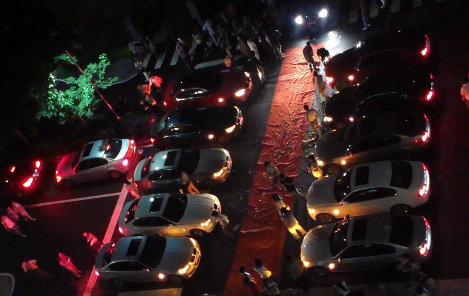 晚上7时40分, “怎么忽然来了这么多豪车?”11辆宝马齐刷刷开到了湖南师范大学木兰路学生公寓前停下,正在公寓门前的黎同学觉得很新奇。7点48分,车上下来几个人,在他们的现场指挥下,11辆宝马开始缓慢地调整队形,10辆宝马排成两排,1辆宝马停在中间,车头正对公寓大门。随后,车队的人搬出音响,接通电源,开始调试音乐。车上的几个人搬下了一条红地毯,从停放在中间的宝马处一直铺到公寓门口,一名男子手捧玫瑰站在红地毯一端。图为求婚现场。
