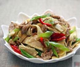 5、加入炒断生的肉片炒匀,加入青红椒片炒匀。