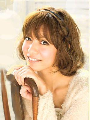 刚及眉的斜刘海,脑后勺向内收的碎发,两鬓微垂的散发,看似微有凌乱之感,实则刘海、发尾和两鬓以及头顶的发箍都是一场精心的设计,很有小鸟依人的轻熟女的感觉,甜美感十足。
