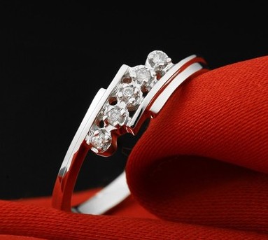 五颗光焰慑人的钻石,粒粒莹彩。指环造型独特,镶嵌的钻石含蓄又能体现手指的绚丽动感。