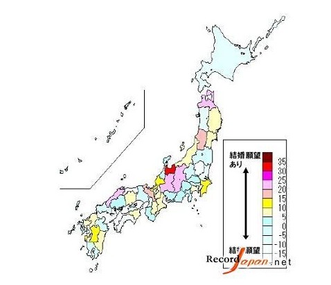 Record Japan网站报道,继日本女性平均胸围地图之后,近日日本媒体又以近4万名15至80岁男女为对象,就“恋爱和婚姻”意识做了相关调查,并按各地居民结婚愿望强烈程度制成了“结婚愿望地图”。