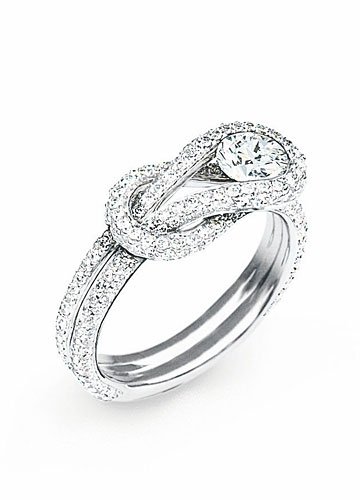 好似闪闪发光的玫瑰花径,上面镶嵌着完整切割的圆形明亮形车工钻石,周围陪衬着橄榄形美钻和优雅的密镶花径。宛如是女子从花丛中采的心爱花束,爱不释手。