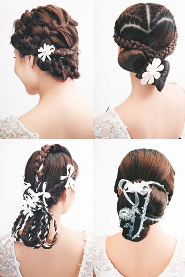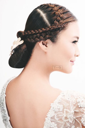 优雅发髻辫:结合了丸子头和蜈蚣辫两种打造手法。用精致的蜈蚣辫缠绕在丸子头顶端,打破传统高发髻的沉闷,最后利用精致的水晶发花点缀在耳际上方,亮点十足。